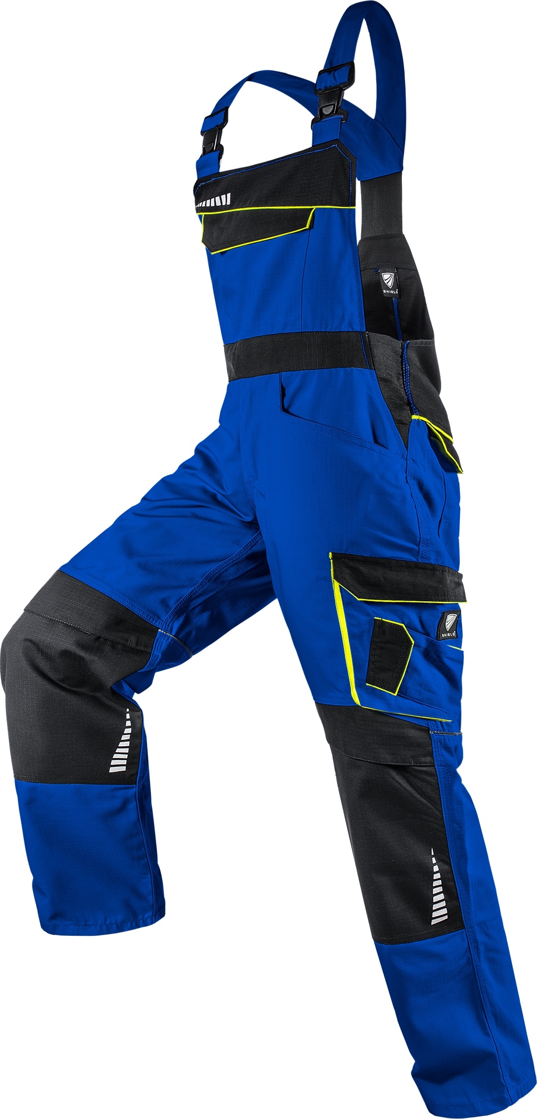 stabile Trägerschnallen - konfektionierte Träger - Trägerzwischenstück aus kochfestem Elastik - aufgesetzte Latztasche mit Patte und Druckknopfverschluss - Front mit aufgestepptem Bundband - elastische Bundweite durch beidseitige Stretcheinsätze - Hosenschlitz mit Nylonreißverschluss - 2 eingesetzte Vordertaschen - 2 Gesäßtaschen mit Patte und Druckknopfverschluss - links Cargotasche mit Patte und Druckknopfverschluss und aufgesetzter Smartphonetasche mit Patte und Klettverschluss - rechts Meterstabtasche und aufgesetzte Messertasche mit Klettriegel - Kniepolstertaschen mit Klettverschluss - Reflexpaspel in Seitennaht und zusätzlich aufgepatchte Reflektoren